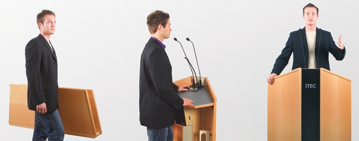 Place, open, activate! That is how fast the lectern and thus the entire sound system is set up. Two microphones attached to the lectern allow for great freedom of movement and the wireless microphones enable the lecturer to involve the audience during discussions. The ITEC Lectern Success is the system of choice for commemorative speeches, podium discussions