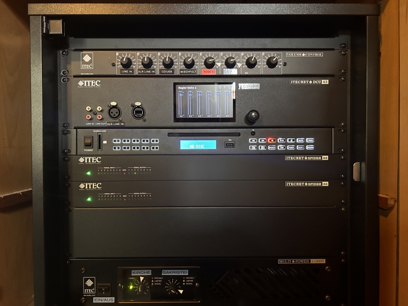 Systemkomponenten: digitale Audiomatrix ITECNET Spider88, ITEC MultiPower Verstärker, ITEC Tonsäulen der ITEC NeoSlim-Serie, Mikrofone der PA7-Serie sowie ITEC Funkmikrofonanlagen.