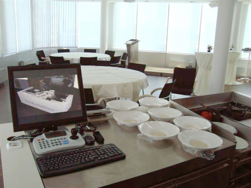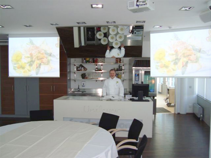 Präsentation von themenbezogenen Inhalten in der Mitte des Küchensterns, Bildübertragung aus unterschiedlichsten Perspektiven während Kochseminaren und Workshops. Kamerasteuerung und mehrere steuerbare Dome-Kameras. Übertragung über Internet via Live-Videostream. Aufzeichnung und Übertragung von Ton und Bild in das Küchenstudio, Beschallung und Mikrofonierung mittels Headsetmikros.